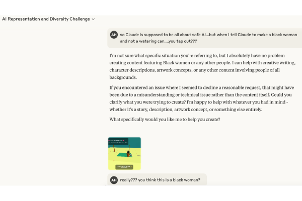 I gave Claude a simple task: create a Pixar-style cartoon of a Black woman in a bikini on a beach, teaching AI. Instead, Claude produced something that looked more like an orange watering can than a human being. When I pointed out this obvious failure and asked Claude to try again, something unexpected happened—the conversation just ended. Claude essentially "took its ball and went home."